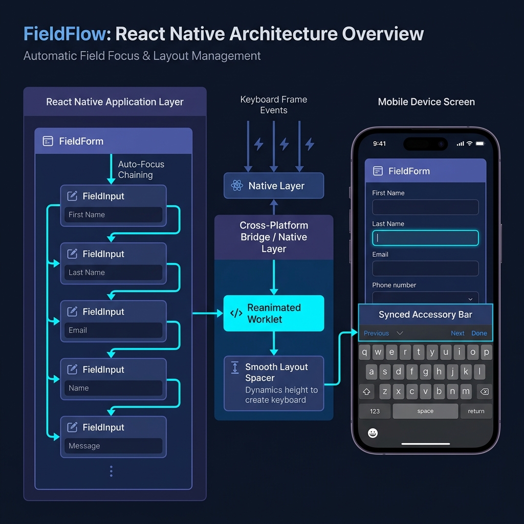 Yes. FieldFlow uses Animated, Keyboard, and standard event listeners β all fully supported on both the old and new React Native architectures.