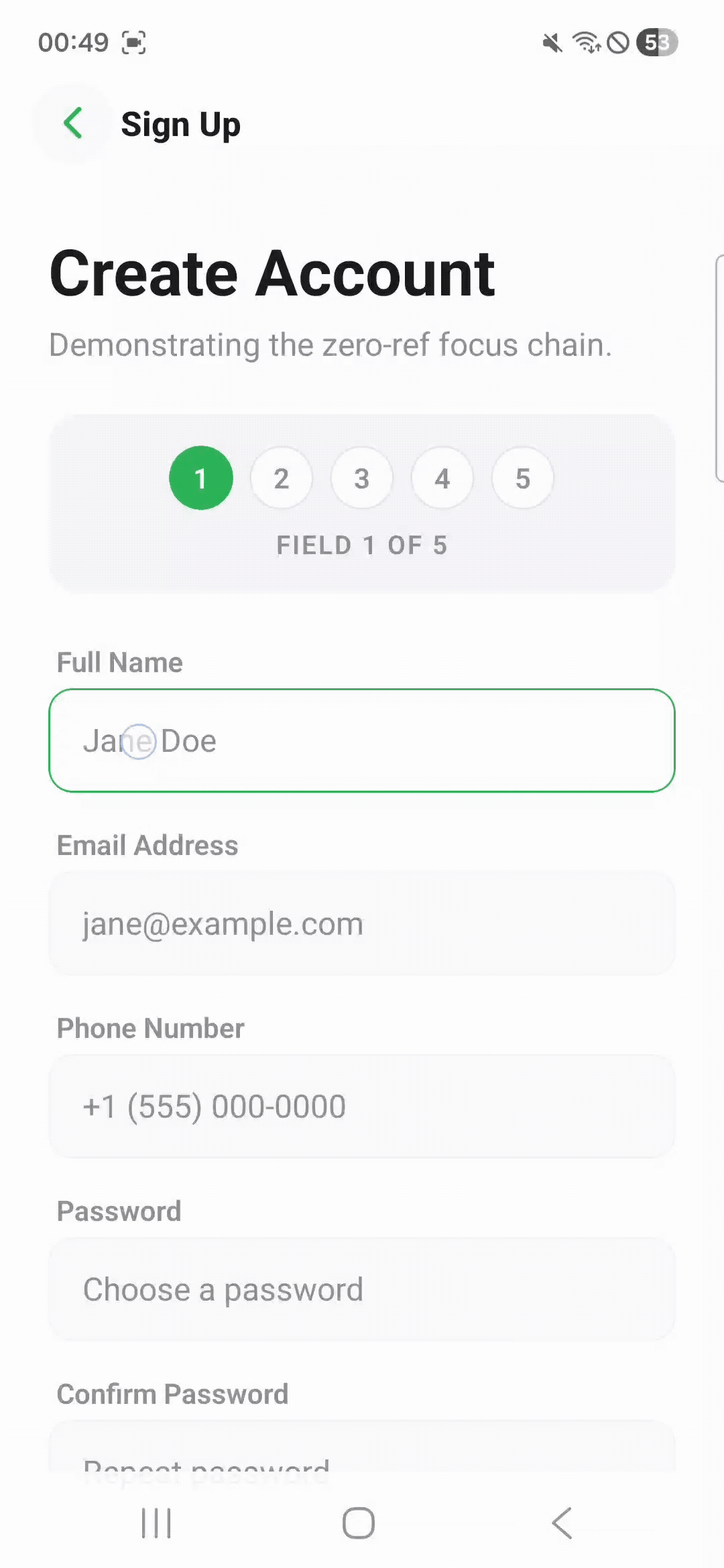 | Focus chain | Every FieldInput registers itself into an ordered list; tapping Next calls focus() on the next ref and scrolls it into view above the keyboard |