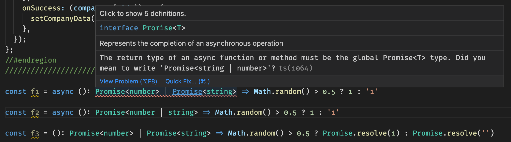 Promise<A> | Promise<B>is stricter thanPromise<A | B>and to the point that it won't work with async functions.In the case of