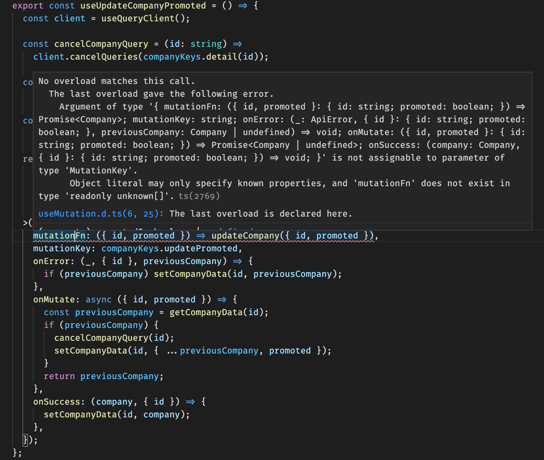 onMutate, because we currently define its type as, when we set an async function to it we'll receive a type error but it's very obscure and appears at another place.
