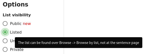 Here's my suggestion for the tooltips of each visibility option. @alanfgh, do you confirm this is okay? (see @AndiPersti screenshot above for where these tooltips will be displayed) Private Unlisted Listed Public |