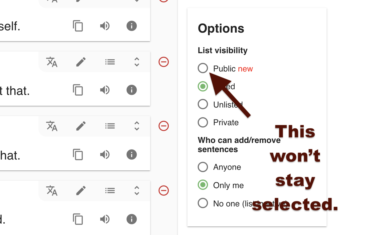 its me again, I made some more adjustments. For starts I show now all public lists and own lists instead of just the users own lists. I think its for the user more interesting to see in which (public) lists the sentences is. he only can remove them if he got the remove right. also the options to remove sentences are only visible for members.
