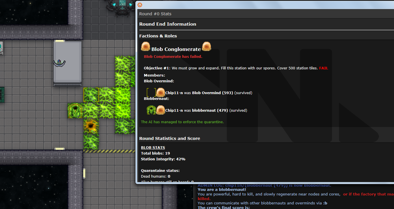 - Спрайт блоббернаута - Спрайт жизней ядра - ФФ отключён для блоба - Блоб имеет отдельный список мобов, дабы один бедолага не проверял ВСЕХ мобов на сервере на блоба - Блоб теперь прозрачный. Споры теперь более умные, а люди теперь не играют в казино с блобом. - Все структуры блоба теперь работают от максимального ХП, а не изначального