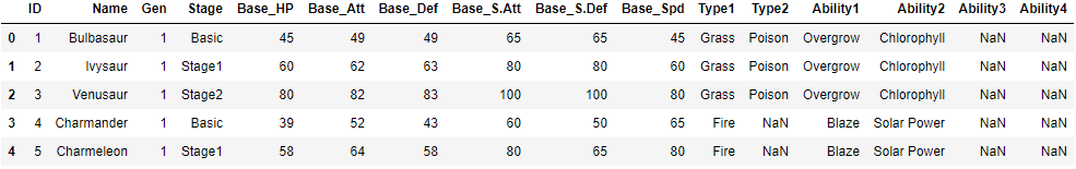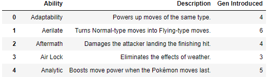 After looping through the dataframe and parsing the abilities out to 4 new columns, we have our first completed table: