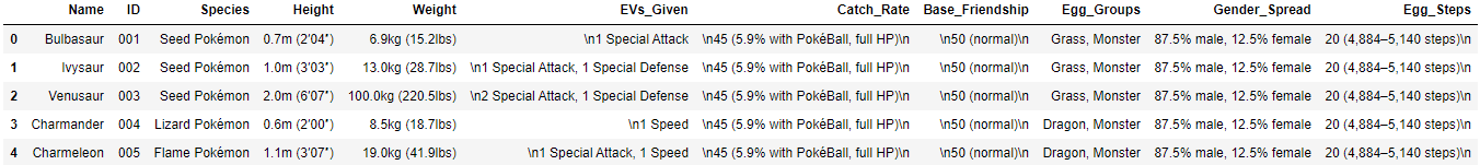 Using Regex, Pandas functions, list comprehensions, and a large looping section to handle the EVs_Given, the following table is our final output for the Pokemon_Details table: