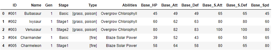 At this point, the 'Type' and 'Abilities' columns are not suitable for a postgreSQL database and will need exploding into new columns.