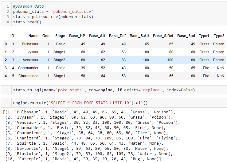 After connecting to the local postgreSQL server with psycopg2, creating the database, and connecting to the new database with sqlalchemy, we can add the Pokemon .csv files to new tables.
