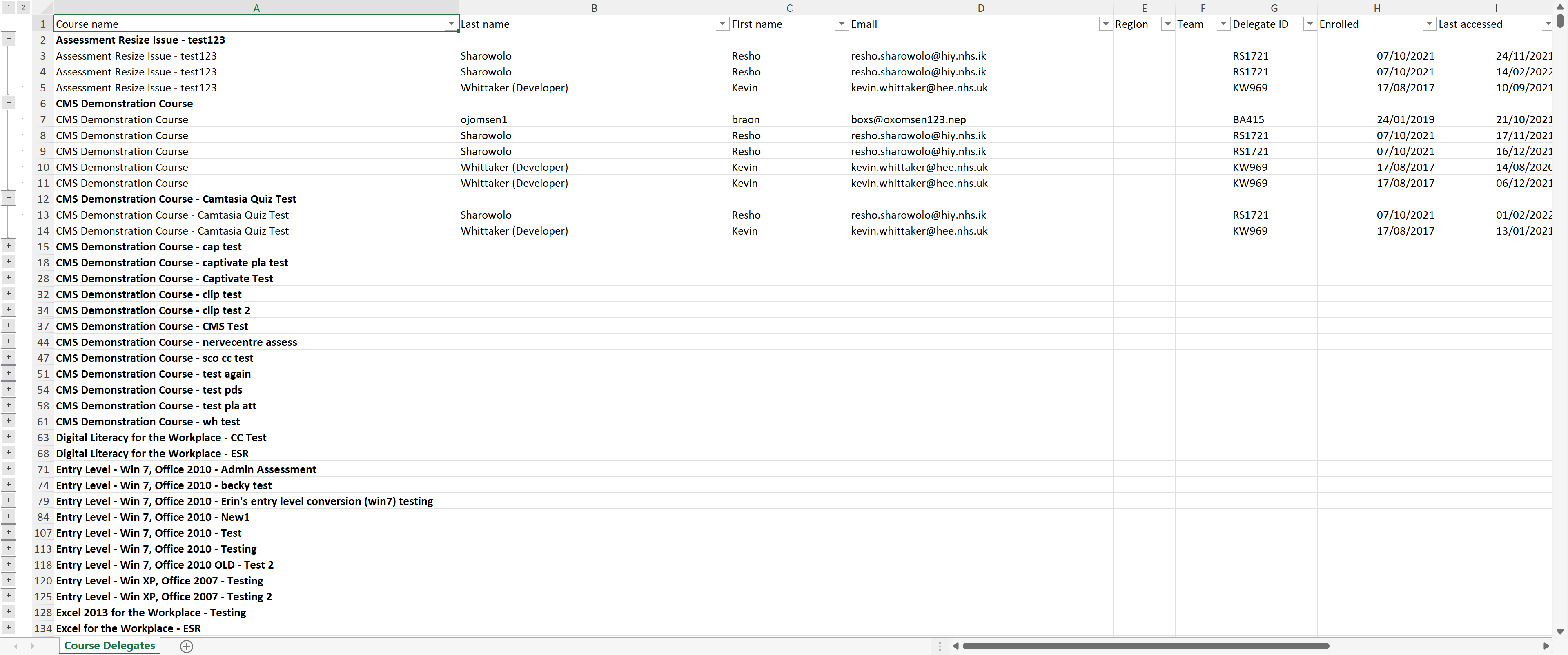 Populates a course name column in column A of the exported Course Delegates spreadsheet so that when filters are applied to the spreadsheet, the course name is still visible. Outline grouping remains in place.