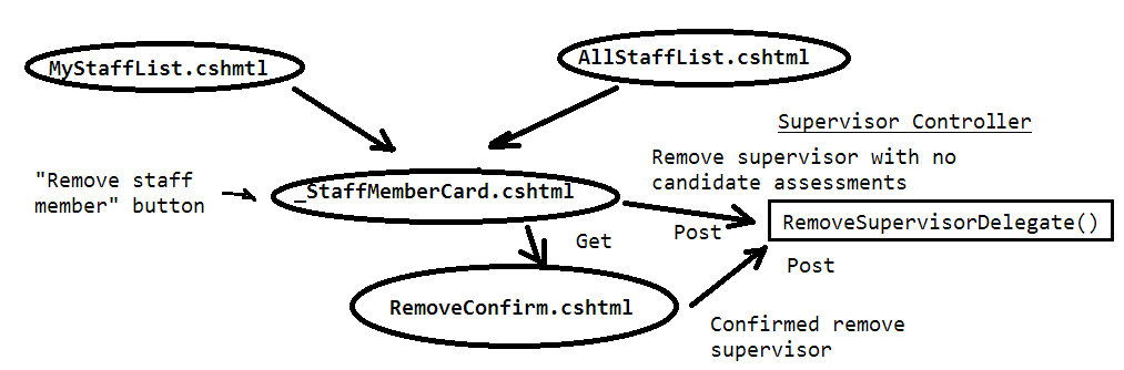 RemoveSupervisorDelegate()method. Confirmation dialog is shown only when there are candidate assessments. So, depending on if there are candidate assessments, I am rendering a link to RemoveConfirm.cshtml or a post button for removing the delegate straightaway.Despite views _StaffMemberCard.cshtml and RemoveConfirm.cshtml are using different models, I can call the same post method, since