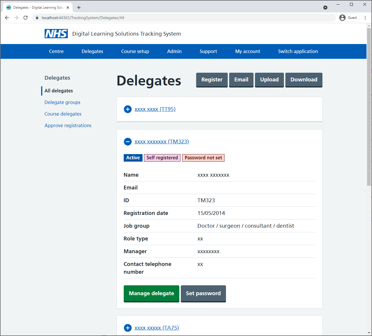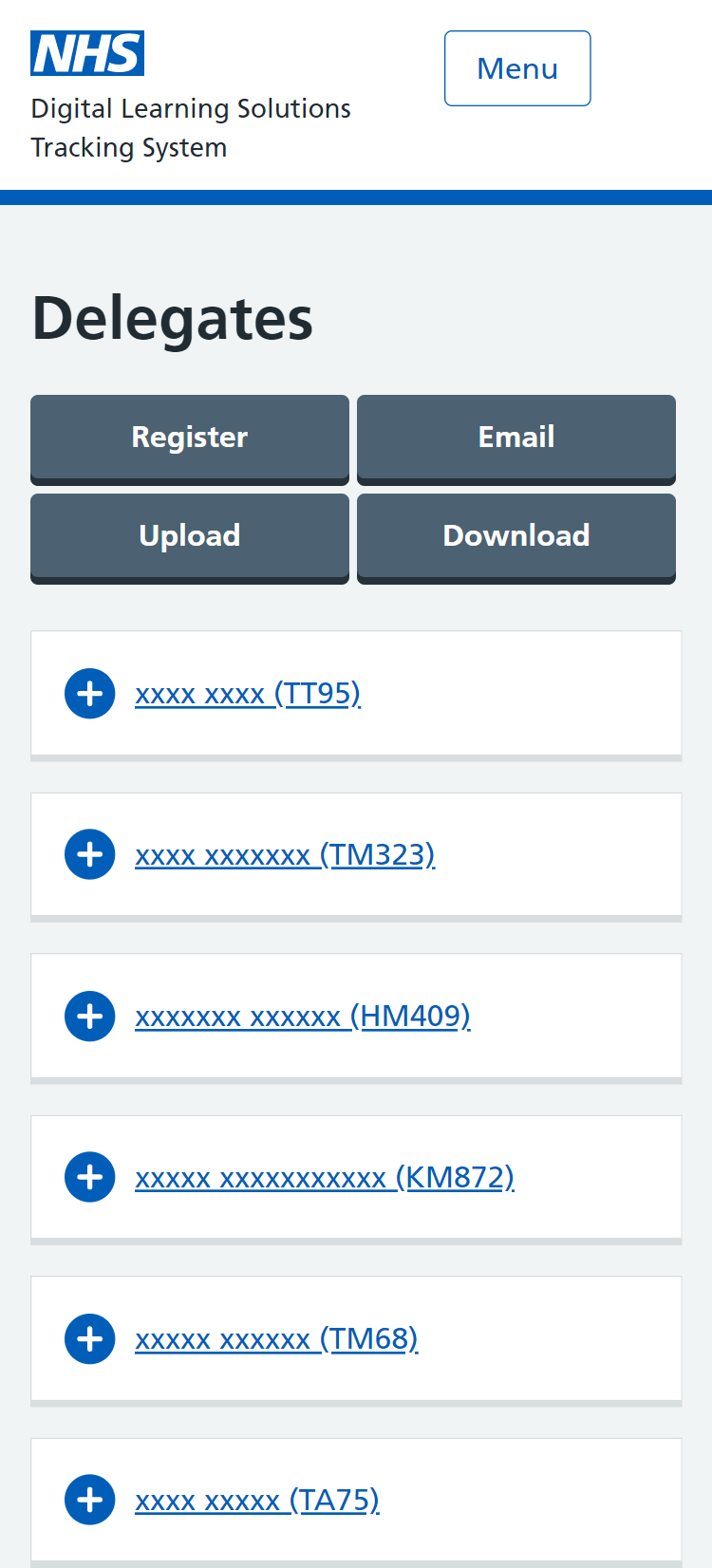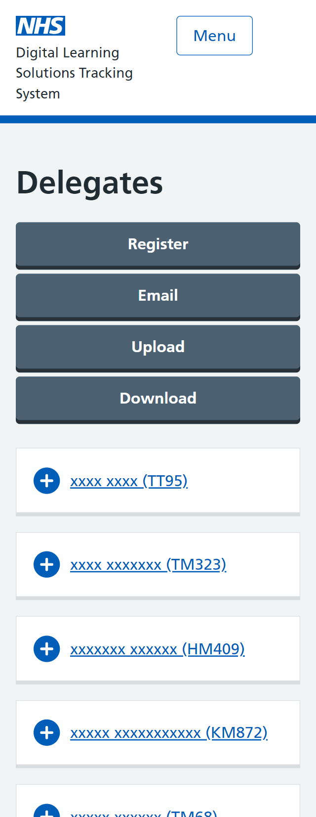 /TrackingSystem/Delegates/All, visible only to centre admins, to display delegate info cards. Currently displays first ten delegates only. Buttons don't do anything.Button group on mobile screen sizes:
