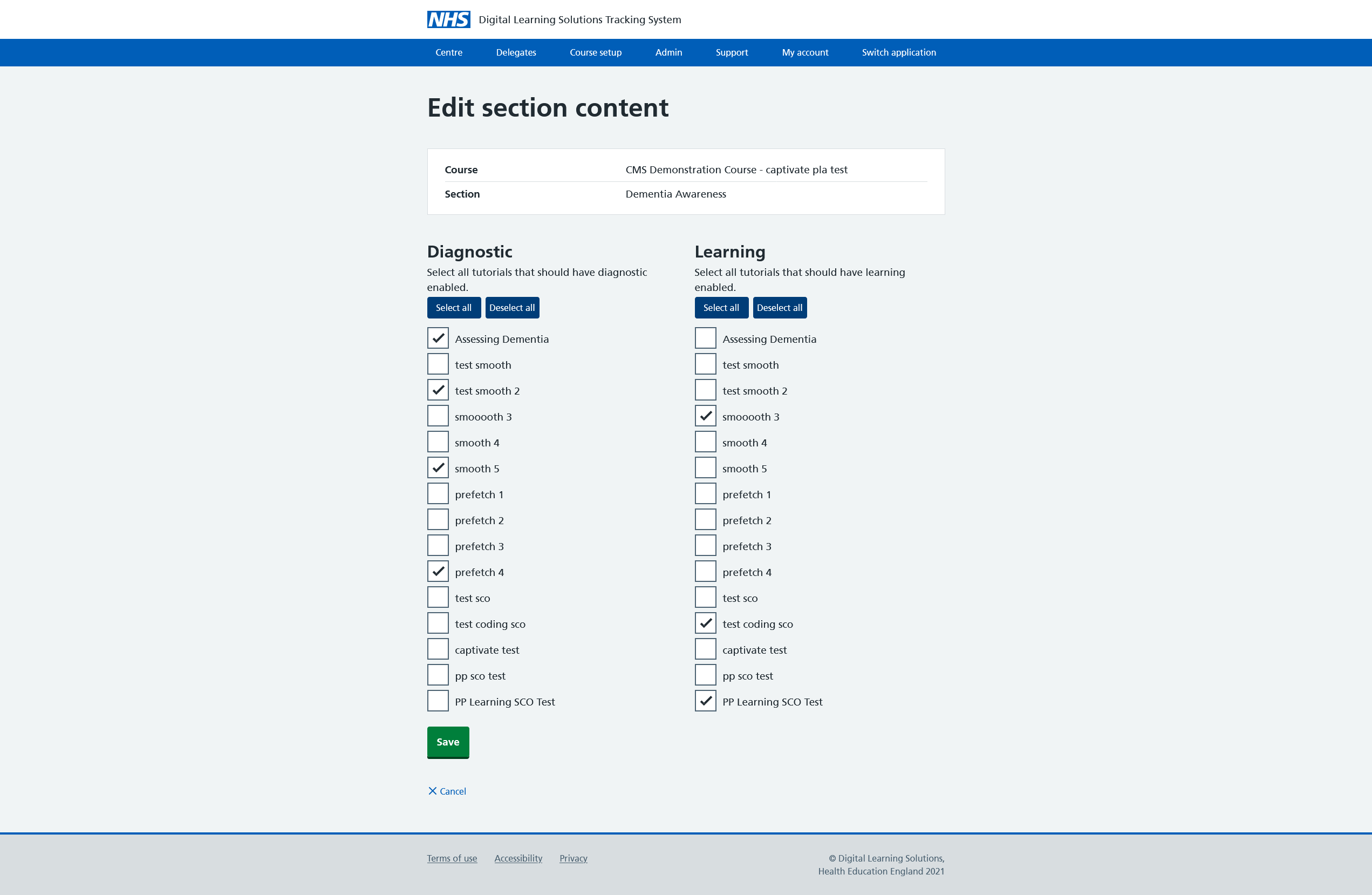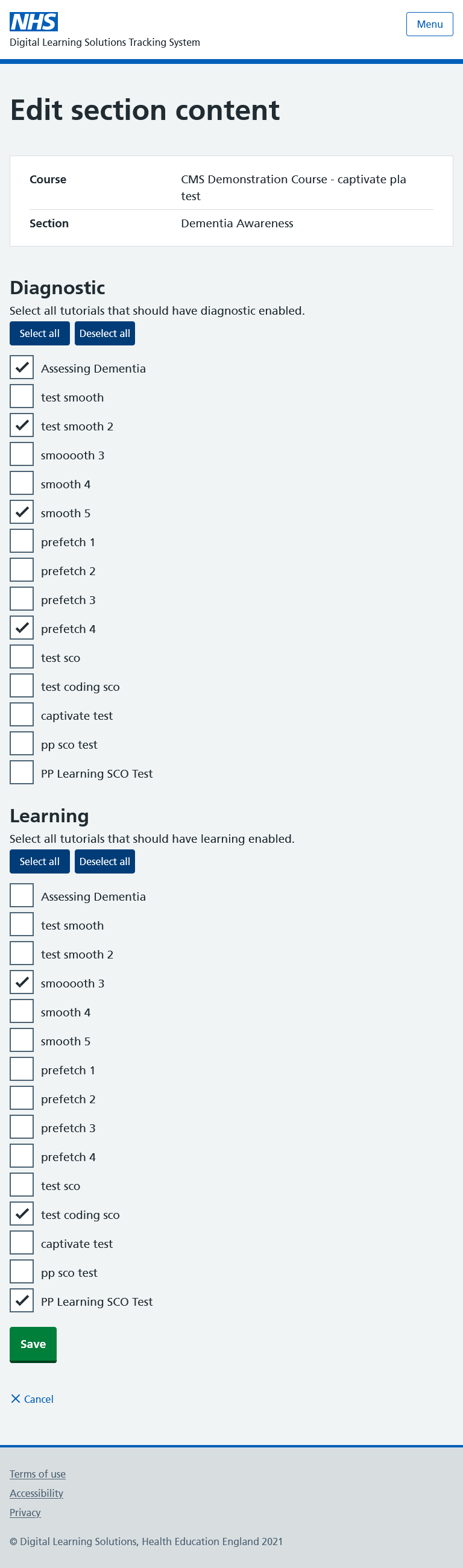Note that a tutorial can only have Diagnostic enabled (often used by centres to test what the delegates already know without necessarily forcing them to go through the learning content),