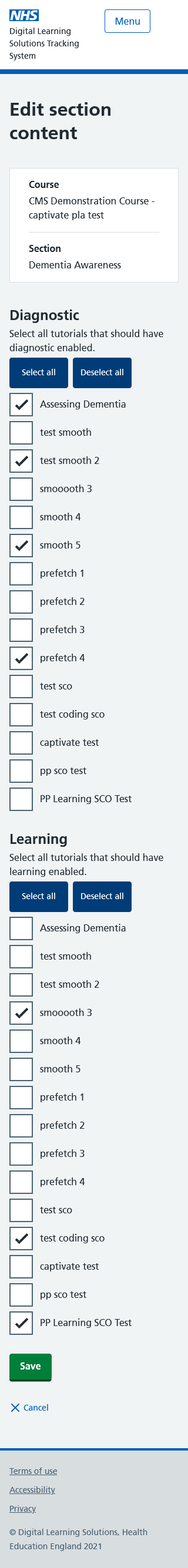 New page to edit the Learning/Diagnostic statuses for each tutorial in a section for a course.
