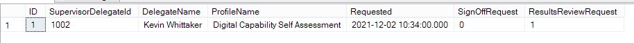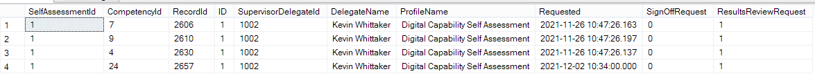 | @"SELECT ca.ID, sd.ID AS SupervisorDelegateId, c.FirstName + ' ' + c.LastName AS DelegateName, sa.Name AS ProfileName, MAX(sasv.Requested) AS Requested, 0 AS SignOffRequest, 1 AS ResultsReviewRequest |