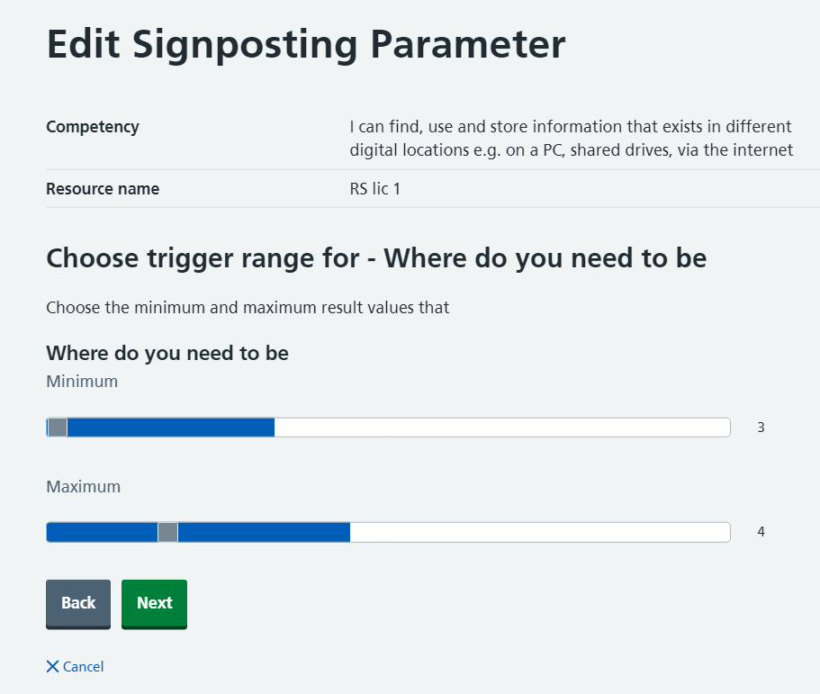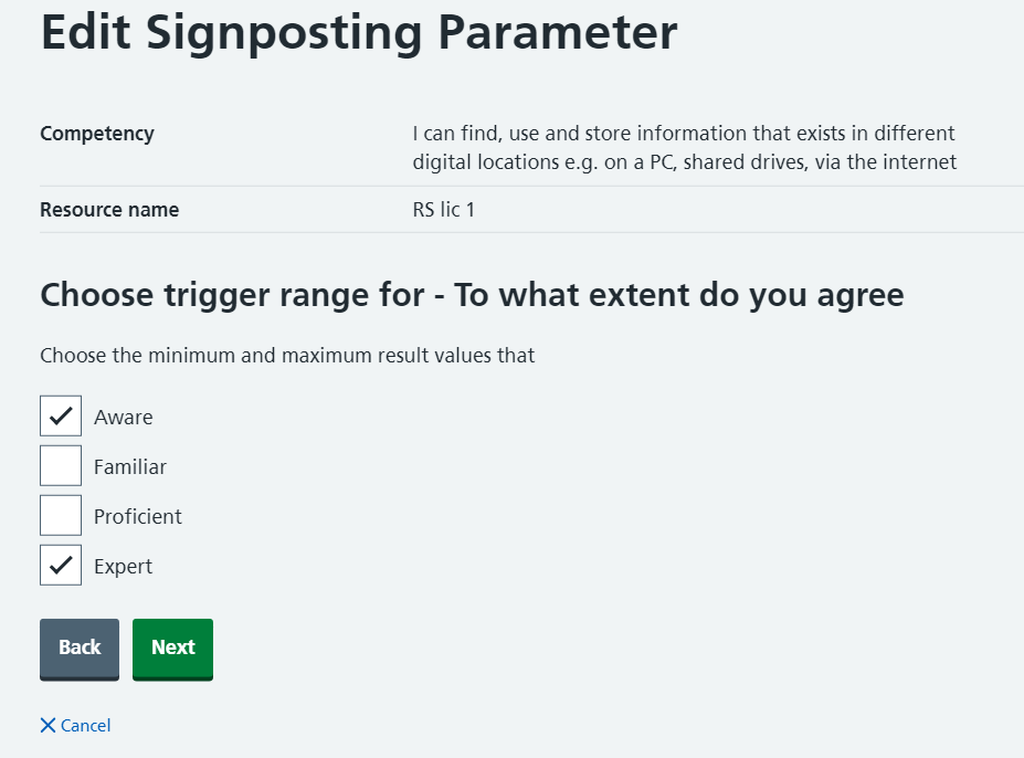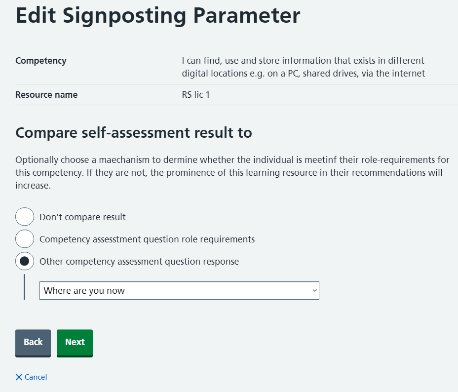 Okay. Almost perfect, now. One last scenario that isn't handled quite right... If I have a competency with either an assessment question with related competency assessment question role requirements or two assessment questions and I skip selecting an assessment question in the first step of editing parameters, I am still shown the "Compare result to" step of the flow (although my selection here isn't shown on the summary). This step should be skipped if the user hasn't chosen an asssessment question and they should be taken straight to the set status step.