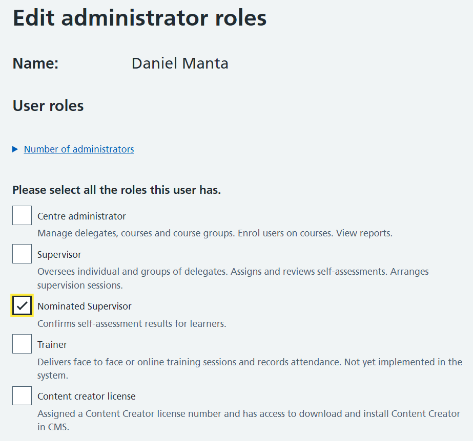 Supervisor/MyStaffList.cshtmlwhen user is nominated supervisor.Supervisor/DelegateProfileAssessments.cshtmlwhen user is nominated supervisor.Administrator/EditAdminRoles.cshtml.Delegates/PromoteToAdmin/Index.cshtml.