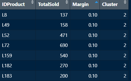 Here a picture of a data.frame with the final output of the model just labelling each product