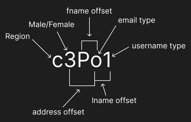 Region: numbers, upper case letters and lower case letters are divided into groups and if the integer representation of the byte (n) of a character is within that group that region is assigned. Same for gender.