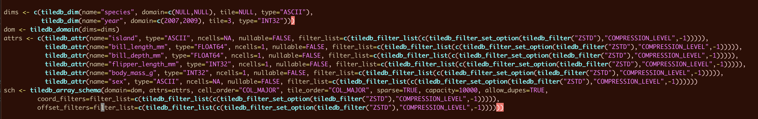attrs <- c(tiledb_attr(name="bill_length_mm", type="FLOAT64", ncells=1, nullable=TRUE, filter_list=c(tiledb_filter_list(c(tiledb_filter_set_option(tiledb_filter("ZSTD"),"COMPRESSION_LEVEL",-1))))),