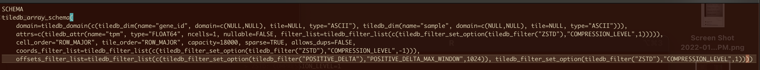 # or Rscript: Rscript -e 'suppressMessages(library(tiledb)); show(schema(tiledb_array(\"$1\")))" >> ${tf}