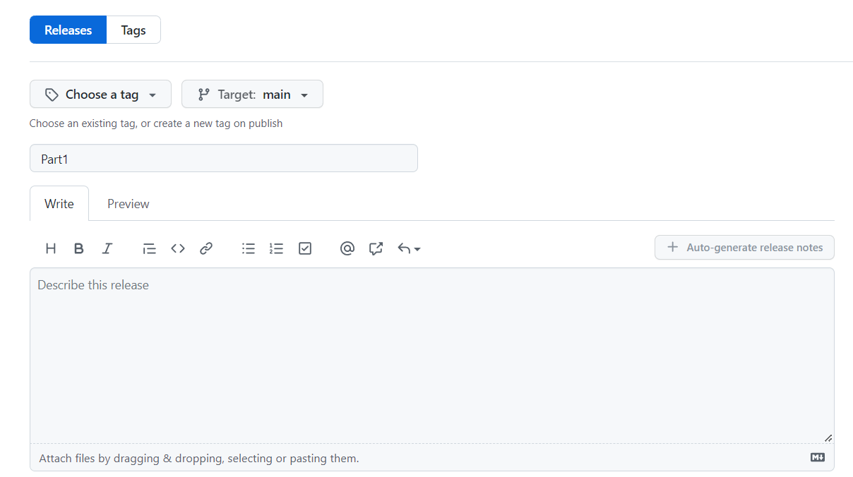git push # push all local commits to Github, this step may need your username and password of GithubFor phase3-part1 submission, please create a new Release, then you can give it a name Part1 to indicate this version is your final version of part1. After creating an release, you can continue pushing new commits and do not need to worry your new commits will influence your part1 grading. For part2 submission, you can just keep your final version of code in your main branch.
