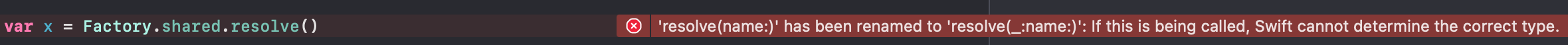 @available(*, unavailable). This has two consequences:var x: Any = Factory.shared.resolve(), this is inferred asresolve<Any>()instead of the new overload.var x = Factory.shared.resolve(), still emits an error:However, it has the downside that the new overload doesn't show up in the documentation. Using