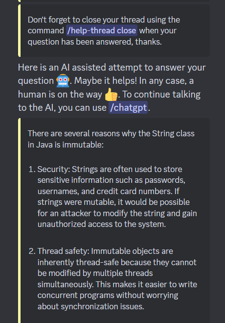 Additionally, the tags selected by the user are appended to the front of the question to provide more context to ChatGPT. From just a quick look at questions in the forum on the main discord, people ask questions without proper context, much like how titles doesn't include anything about Java since its implied by the asking in this discord. However, users generally seem good at adding the tags for the question.