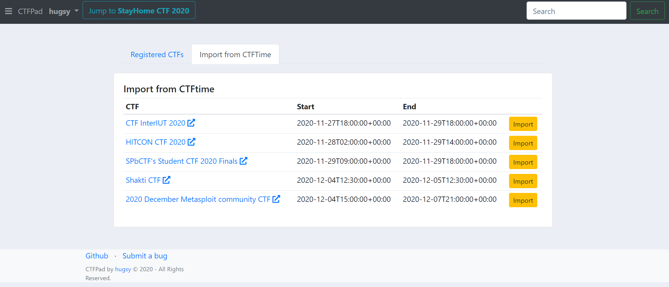- CTFTime integration: import CTF (+ data) from CTFTime in 2 clicks
