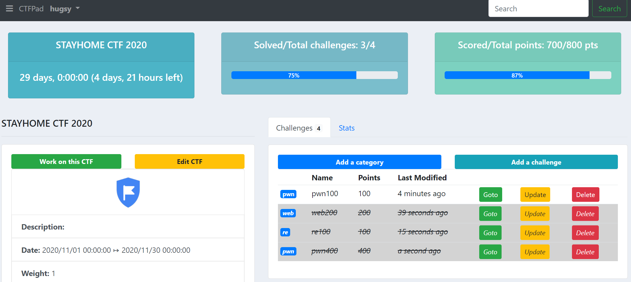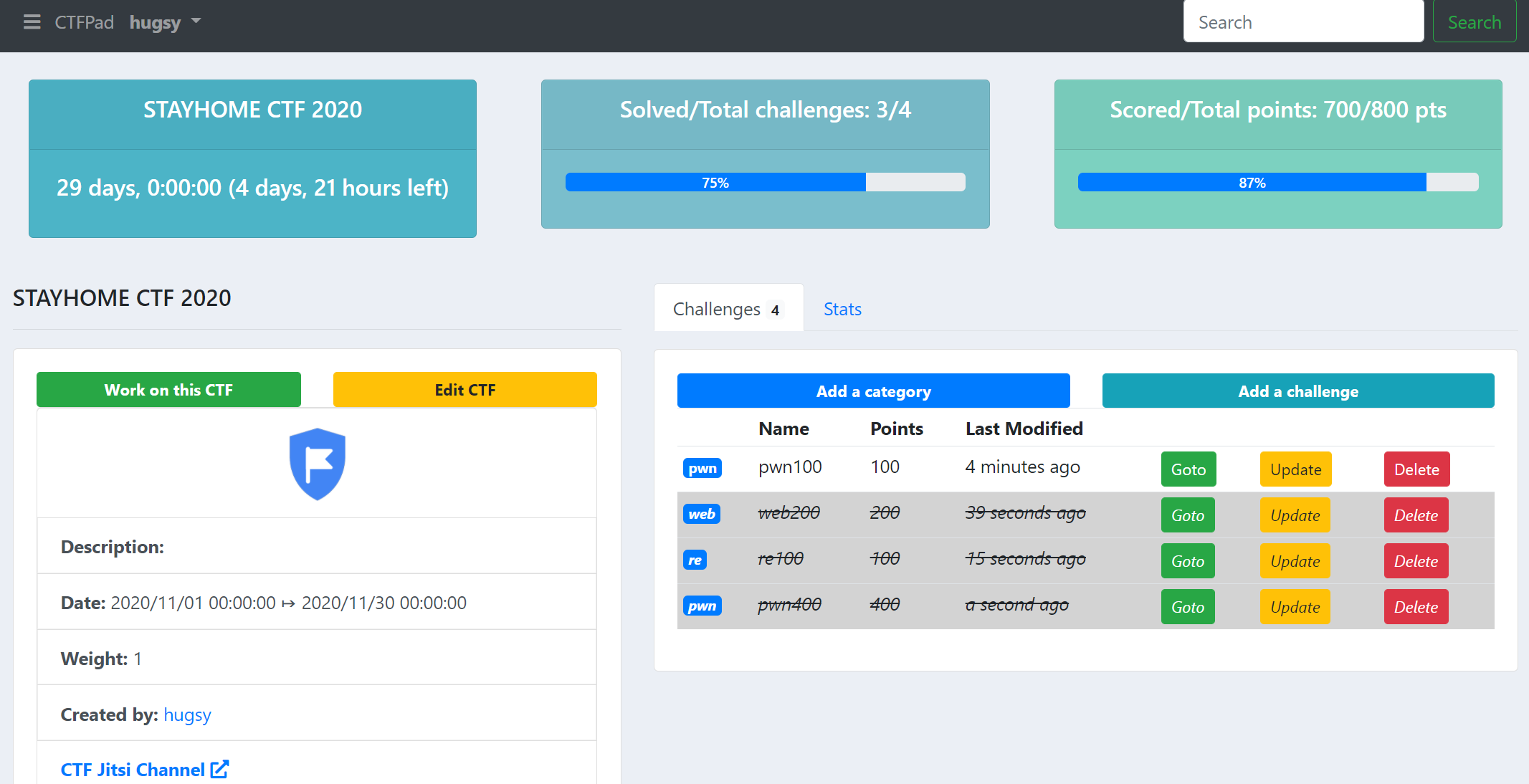 I was fed up of not finding a tool to my liking to manage CTFs for teams playing so I wrote one. You should probably not use it 😋 I wrote it quickly because I really couldn't find something that fitted my needs. Some other projects of the sort of collaboration during CTFs: