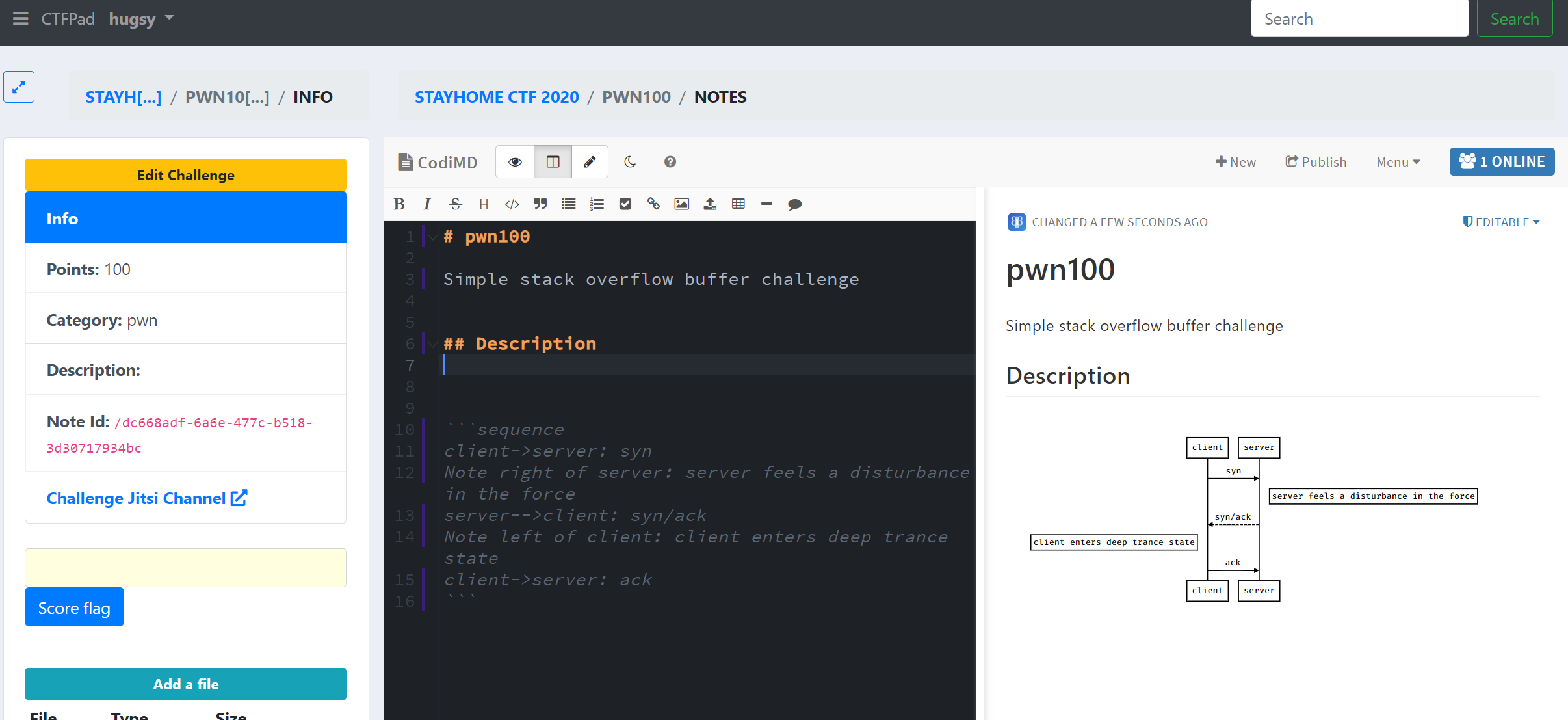 I discovered HedgeDoc (aka. old CodiMD), an awesome platform, 100% Markdown, easily integrable. This project is just an eye-candy around using HedgeDoc as a central platform when doing a challenge collaboratively.