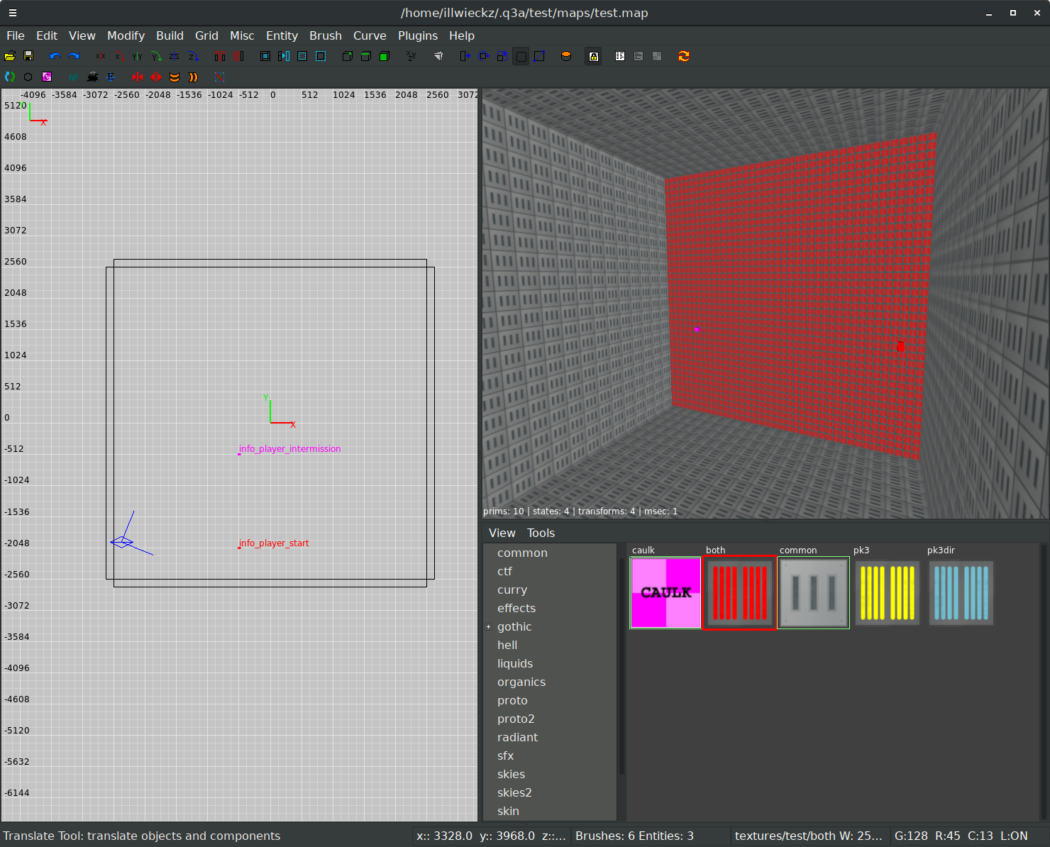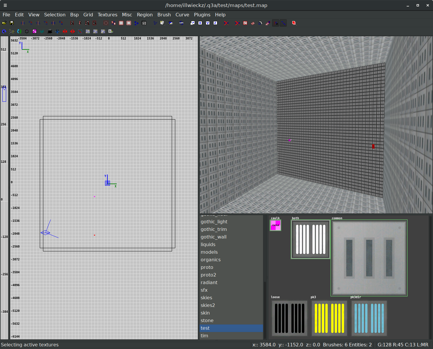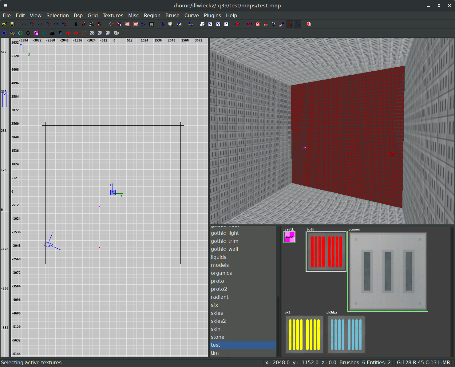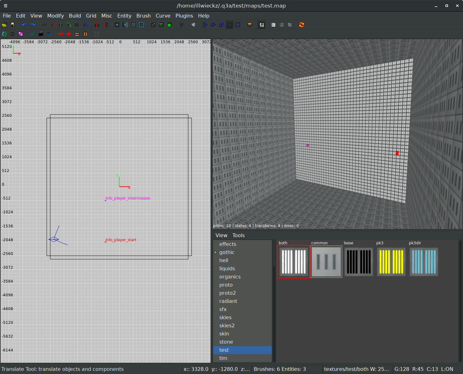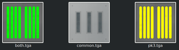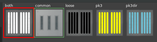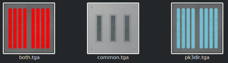 For what I know, in case of I tried to verifiy reading the code but that was boring. So I made a test bed you can download there. It's a This contains a pk3dir, a pk3 and a map, both having a The pk3dir contains 3 textures, one red named The pk3 contains 3 textures, one green named Both Once loaded in radiant texture browser (here NetRadiant), the red one overrides the green one as expected and both blue and yellow are displayed as expected: This is verified in both NetRadiant: And in GtkRadiant: All radiants are GtkRadiant forks so if they don't behave the same, it's a bug. Technically radiant editors load pk3dir as yet another vfs (default vfs being the engine one and the home user one). To test how This is how it is seen within engine, we clearly see that the red texture from the pk3dir was clearly used by q3map2 instead of the green one from the pk3: |
