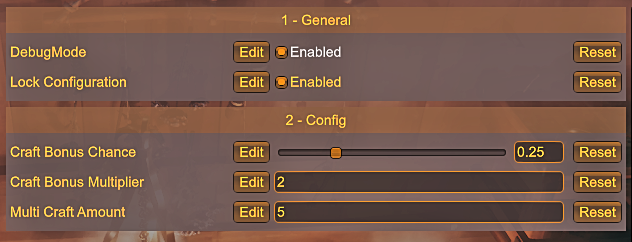 - craft bonus chance → Probability of craft bonus to happen against your current skill level (default = 0.25, which turns into 25% chance at skill = 100)