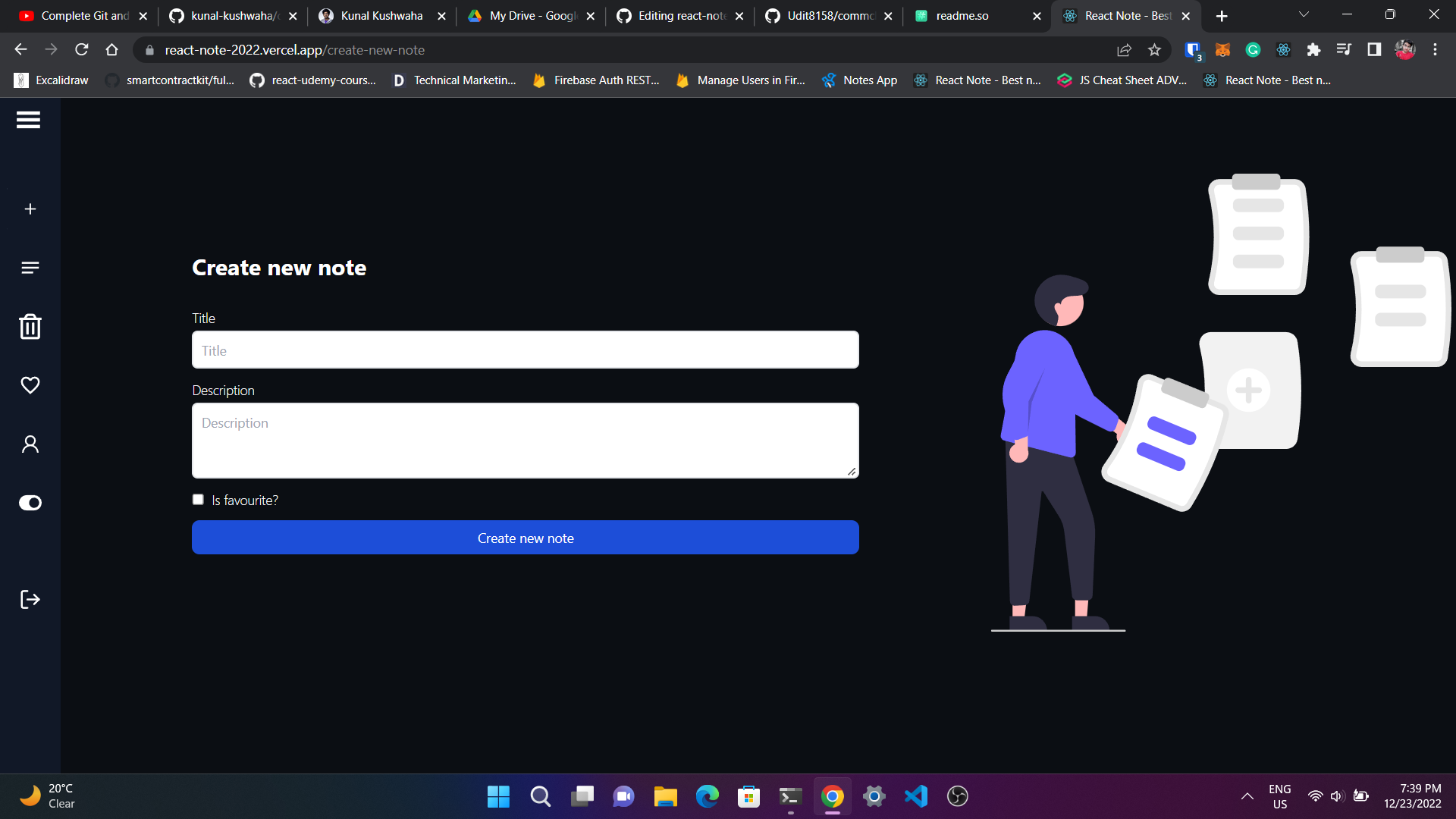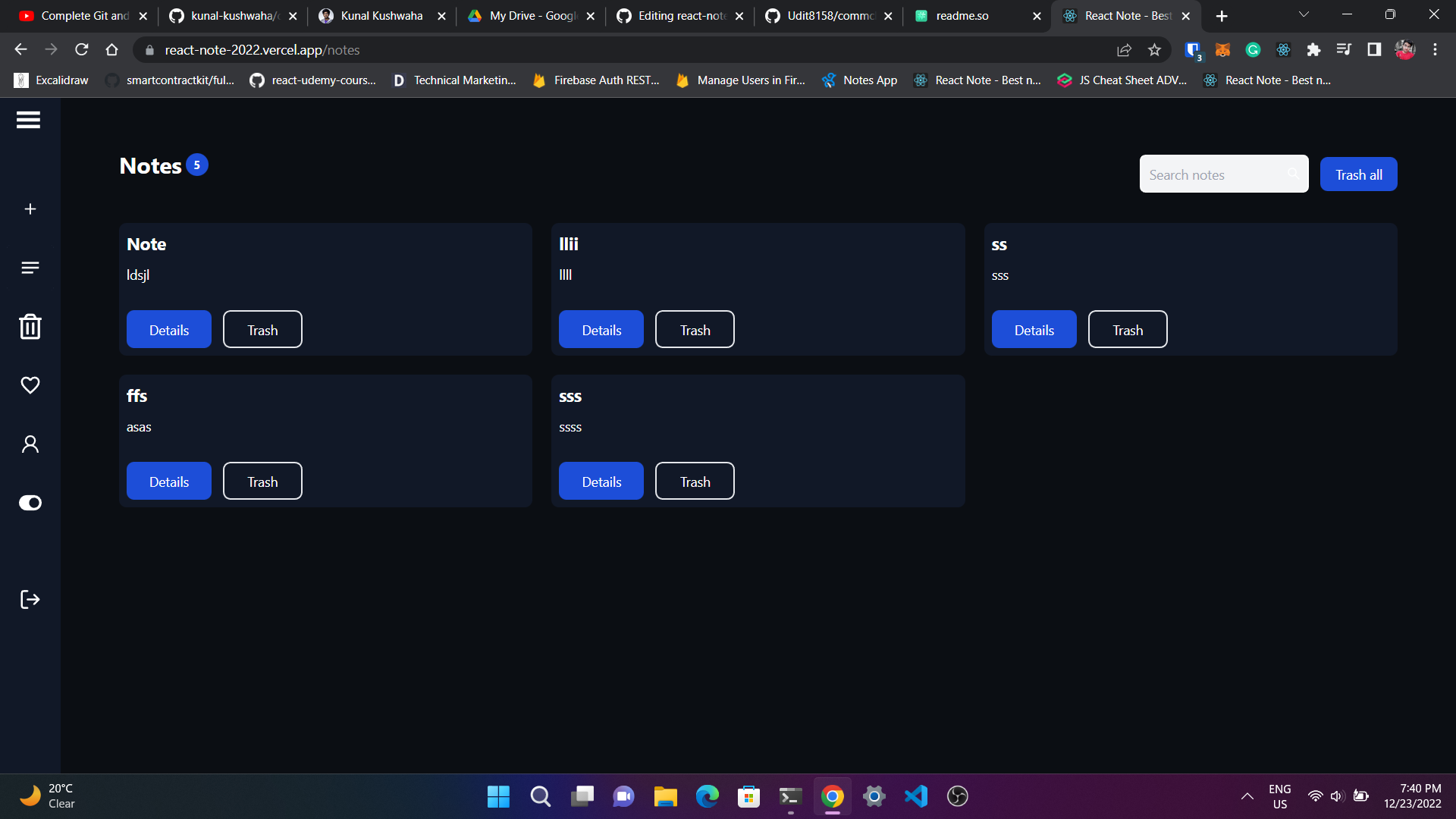 React Note is a simple note web app where you can create your account and make some note.You can also search your notes and also seperate your favourite notes.You can also trash your note.Not only that you can also update your profile like image, name, email and password stuff.Don't worry if you not like this app you can also delete your account.So make sure try it atlease for one.