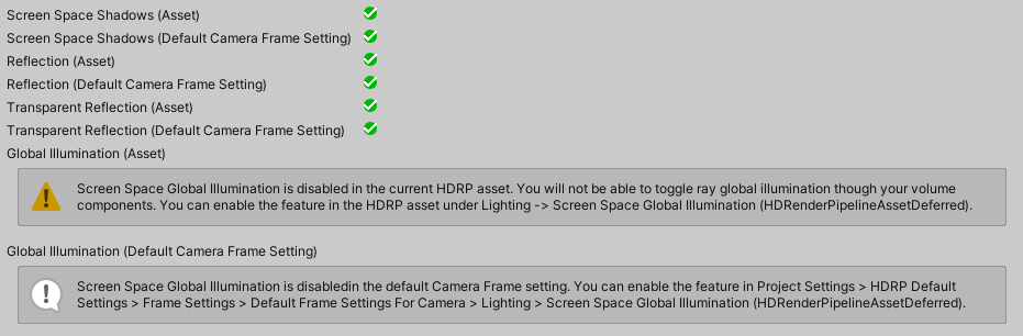 error: "Screen Space Global Illumination is disabledin the default Camera Frame setting. You can enable the feature in Project Settings > HDRP Default Settings > Frame Settings > Default Frame Settings For Camera > Lighting > Screen Space Global Illumination", messageType: MessageType.Info); |