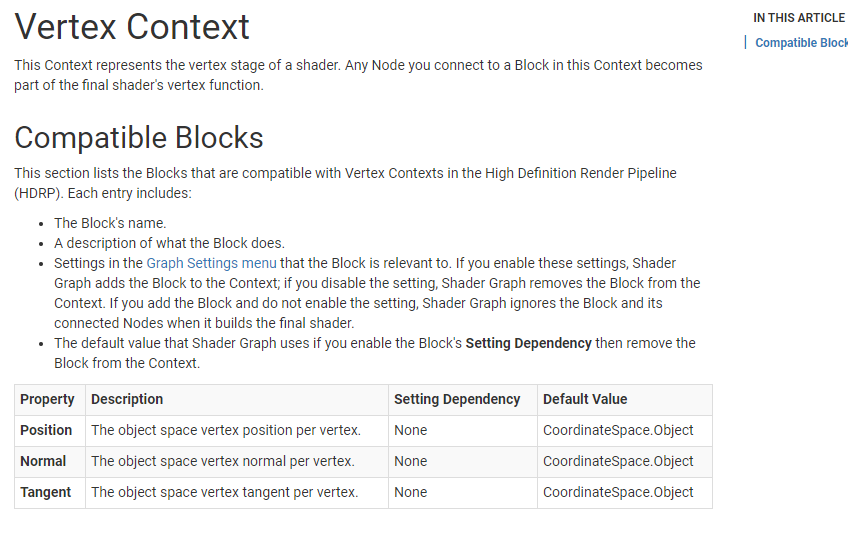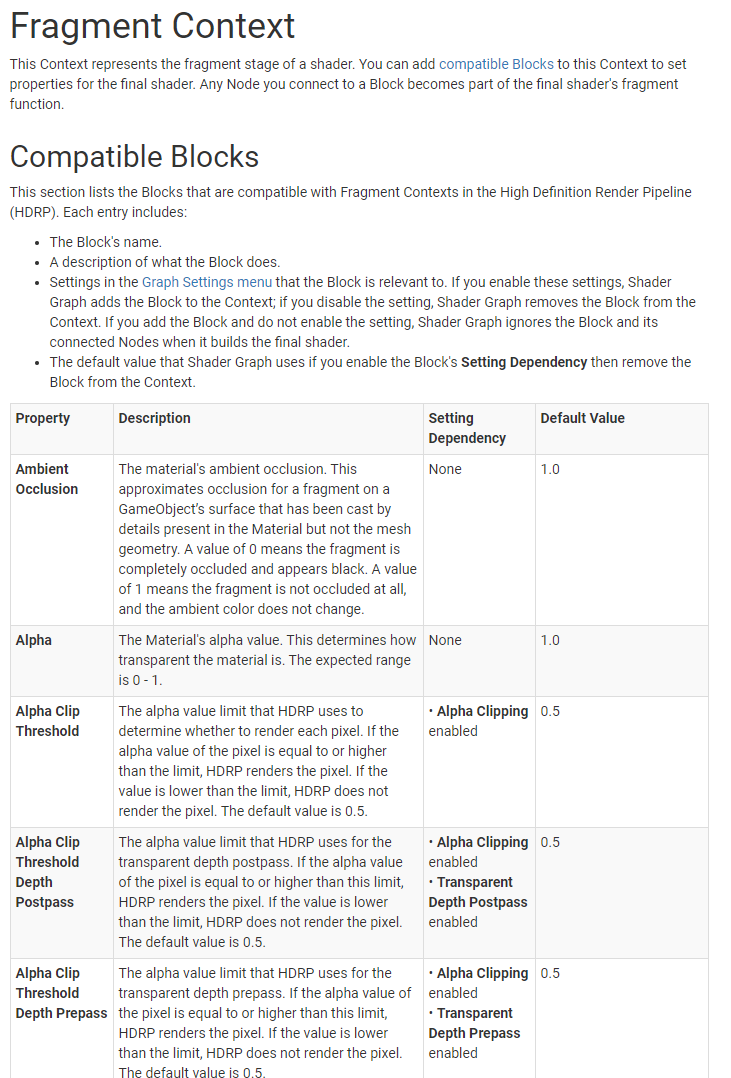 * Added landing page and context/blocks overview page * Added vertex context page and snippets * Added the fragment context page and supporting snippets * Added the decal master stack and the contexts intro * Updated toc * Added vertex context doc * Update TableOfContents.md * Added unlit doc * Added lit master stack doc * Added eye master stack doc * Added fabric master stack * added hair master stack * Added stacklit master stack * Added snippets to support shader stack work * Fixed some formatting bugs * Removed old links * Updated links * formatting Co-authored-by: Lewis Jordan <lewisjordan@unity3d.com> Co-authored-by: sebastienlagarde <sebastien@unity3d.com>