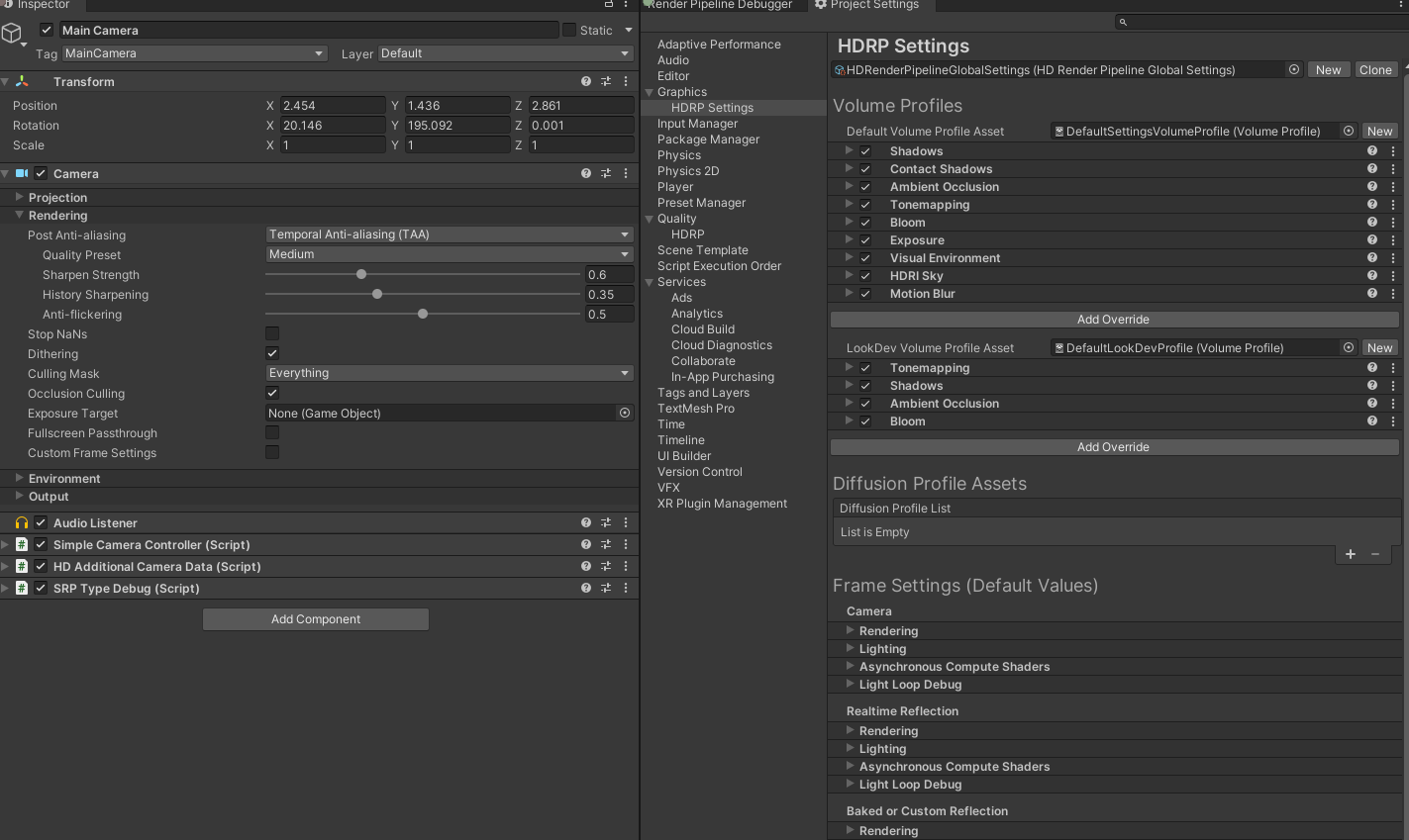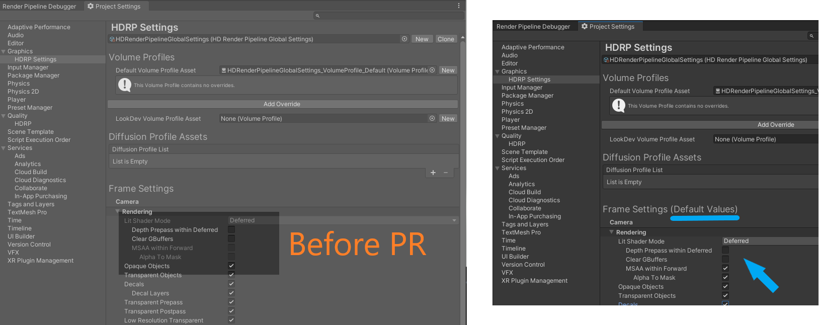 Example of how Frame Settings behave now (Camera / HDRP Global Settings):