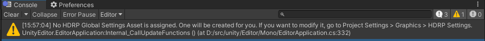 (Example showing error message when switching from URP to HDRP and no HDRP Global Settings asset was assigned in the Graphics Settings)