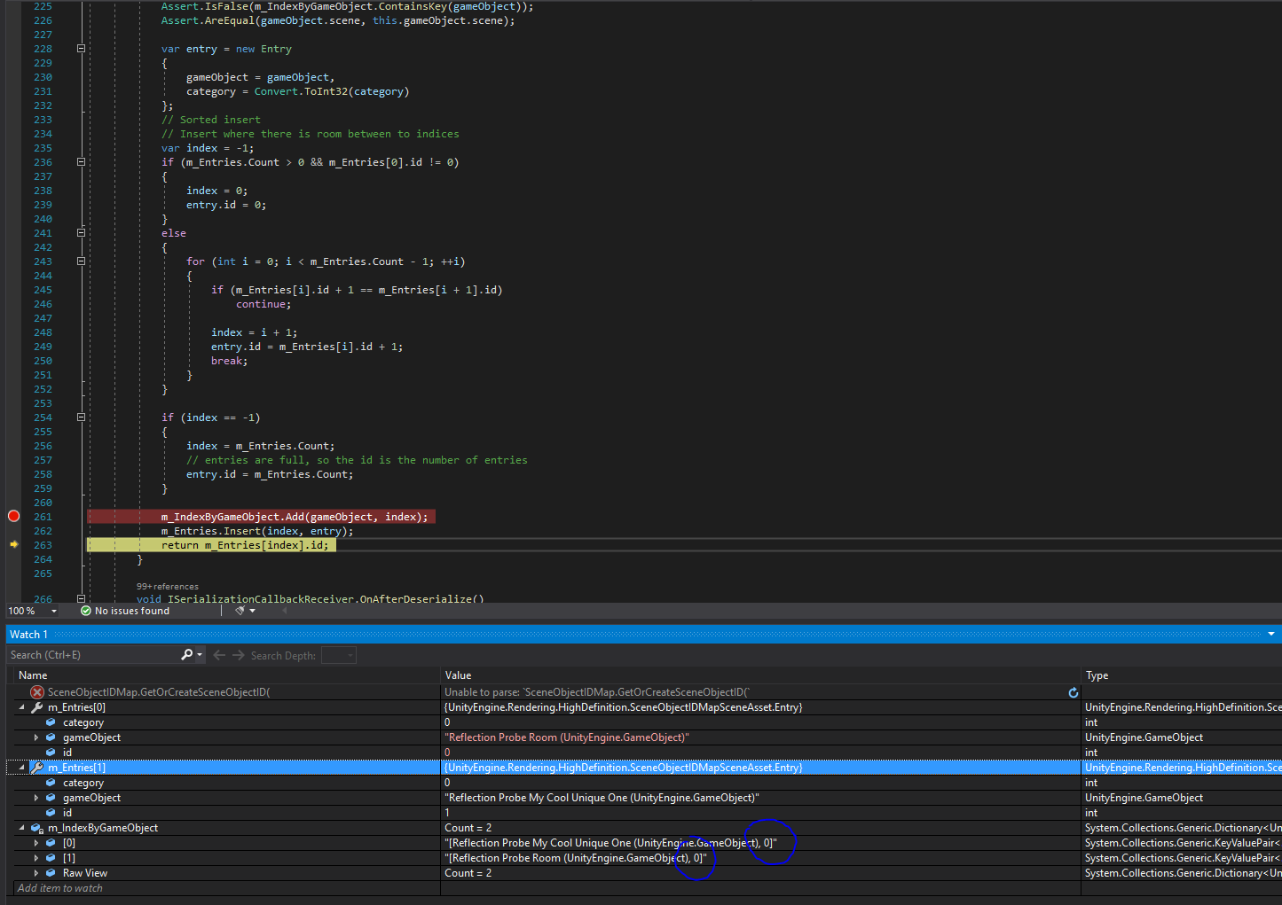 …tionary would get out of sync from the entries list after an insertion occurred to fill a hole. This resulted in a nasty bug where reflection probes would occasionally generate the same bake texture filename as eachother, would overwrite eachothers textures, and would point to the same texture after the bake completed. Issue can be reproduced by baking, removing reflection probes, adding new reflection probes, and baking again.