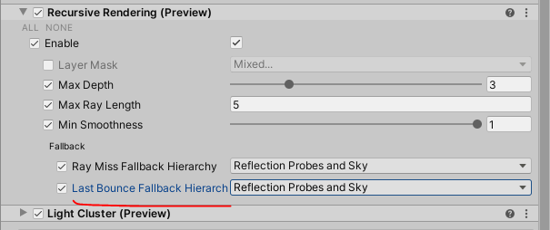| **Last Bounce** | Defines if HDRP should use the reflection probes, the sky, both or nothing as a fall-back for ray-traced global illumination when lighting the last bounce. | |