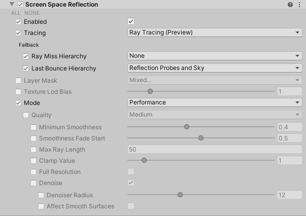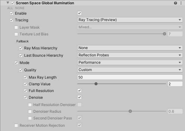 | **Ray Miss** | Defines if HDRP should use the reflection probes, the sky, both or nothing as a fall-back for screen space global illumination when a ray doesn't find an intersection. | |