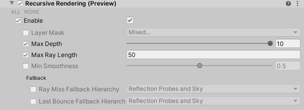 | **Ray Miss** | Determines what HDRP does when recursive rendering (RR) doesn't find an intersection. Choose from one of the following options: <br/>•**Reflection probes**: HDRP uses reflection probes in your scene to calculate the last RR bounce.<br/>•**Sky**: HDRP uses the sky defined by the current [Volume](Volumes.md) settings to calculate the last RR bounce.<br/>•**Both** : HDRP uses both reflection probes and the the sky defined by the current [Volume](Volumes.md) settings to calculate the last RR bounce.<br/>•**Nothing**: HDRP does not calculate indirect lighting when RR doesn't find an intersection.<br/><br/>This property is set to **Both** by default| |