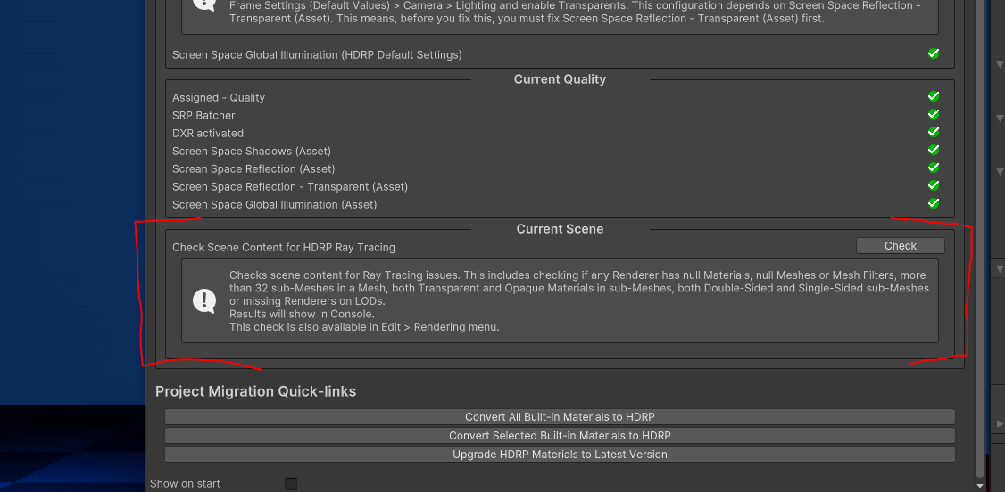 This section contains a "check" button that triggers the "Check Scene Content For HDRP Ray Tracing" Edit > Rendering menu.