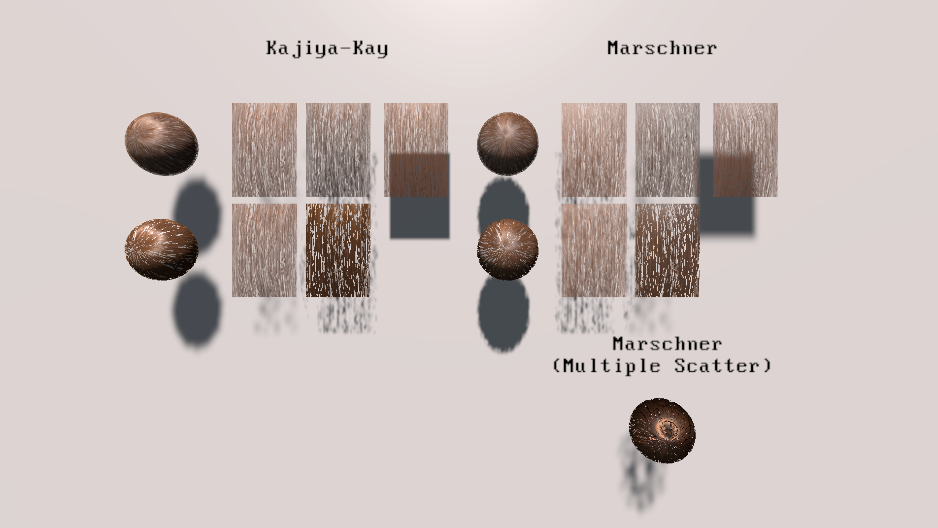 Side note, there is an emissive red ball in the reflection probe causing the red result for the Marschner quads, which evaluate environment lighting different from Kajiya. Additionally, the test quad doesn't have any meaningful strand count probe as input to the model, so the visual result is not relevant in this case.