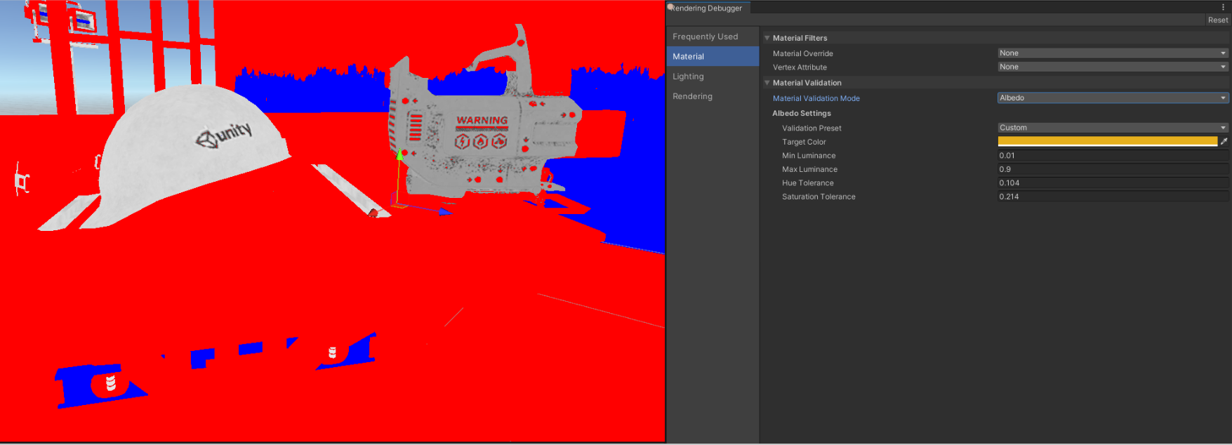 . This makes sense from API point of view, and also useful from user perspective: In the images above, the custom color has been set to yellowis-orange, which matches the albedo of helmet and power tool, and gives error colors for other albedos:Testing status