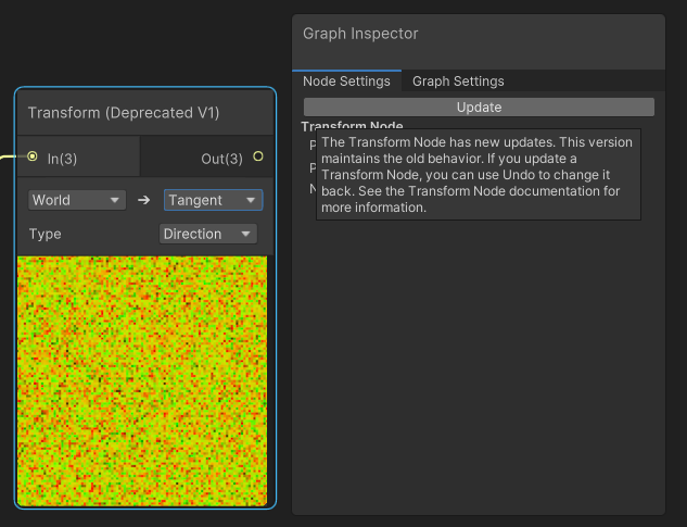 The changes are implemented as an upgrade on the node. Existing Transform nodes will now show up as "deprecated", with an update button to allow a manual user upgrade to the new behavior: