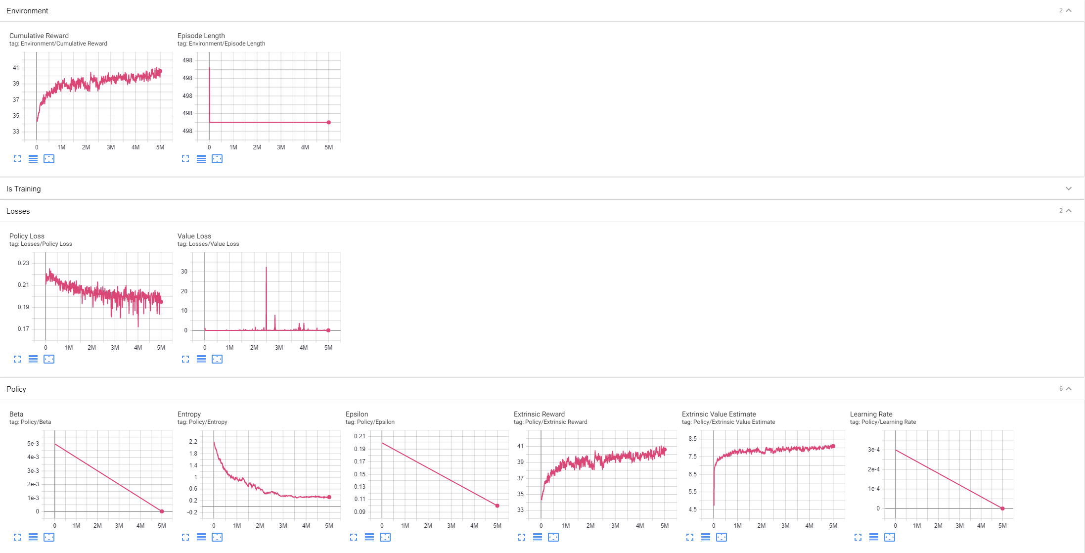 Using proposed values I was able to achieve scores of 40-41 with the same max steps. I have added a trained onnx file in the project folder.