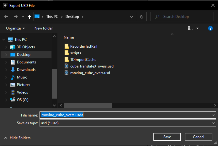 Does it have to be in usda? We can maybe suggest all compatible formats if you give: "usd,usdc,usda". The save panel will then show as able to handle these formats. It would also make things easier if someone wants to overwrite an existing file.