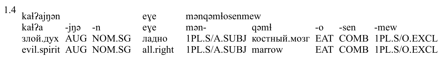 3 мынӄымԓёченмэв _ VERB _ _ 1 parataxis _ Gloss=1PL.S/A.SUBJ-костный.мозг-EAT-COMB-1PL.S/O.EXCL