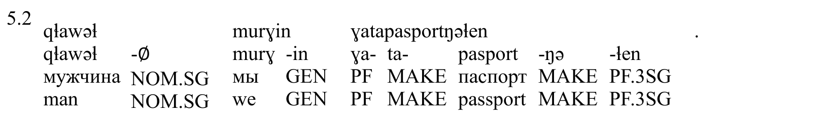 3 гатапачпортӈыԓен _ VERB _ Aspect=Perf 0 root _ Gloss=PF-MAKE-паспорт-MAKE-PF.3SG