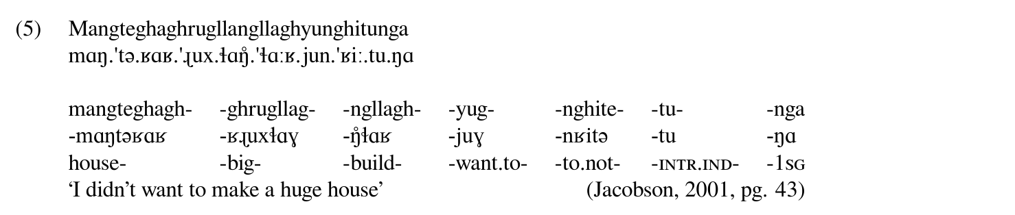The Inuit languages have a similar structure as this example from Jacobsen's grammar of Yupik: