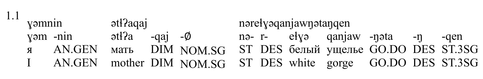 3 нырэԓгыӄанъявӈытаӈӄэн _ PROPN _ _ 0 root _ Gloss=ST-DES-белый-ущелье-GO.DO-DES-ST.3SG